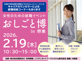 女性限定 事前予約特典有りタイトル 女性のための就職イベント おしごと博 in 堺東 開催日時 2026年02月19日(木)