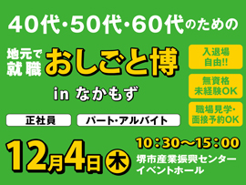 40代・50代・60代タイトル 40代・50代・60代のための おしごと博 in なかもず 開催日時 2025年12月04日(木)