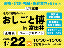 医療・介護・福祉・保育 事前予約特典有りタイトル 医療・介護・福祉・保育業界で働きたい!おしごと博 in 富田林 開催日時 2026年01月22日(木)